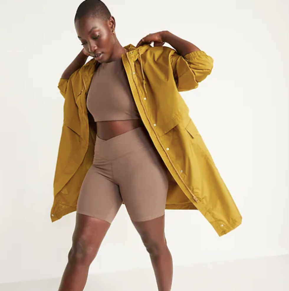 This modern update on the raincoat is a top seller at Old Navy for great reason. It's attractive, it wicks away stray raindrops, and with three color options and a size range of XS to 4X, it will be a great option for folks of many sizes and styles!