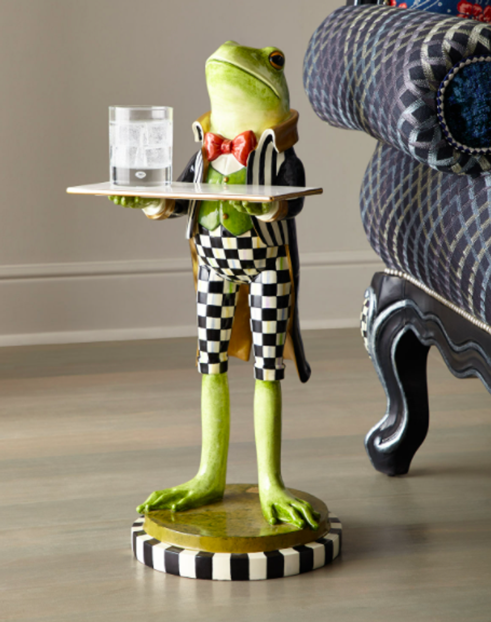Throw everyone for a serious loop when you put this dapper guy on display to hold drinks, snacks, candles, and anything else you might want to keep handy. His checkerboard suit and stern expression give him a serious tone that only highlights the hilarity of having a frog butler in your home.