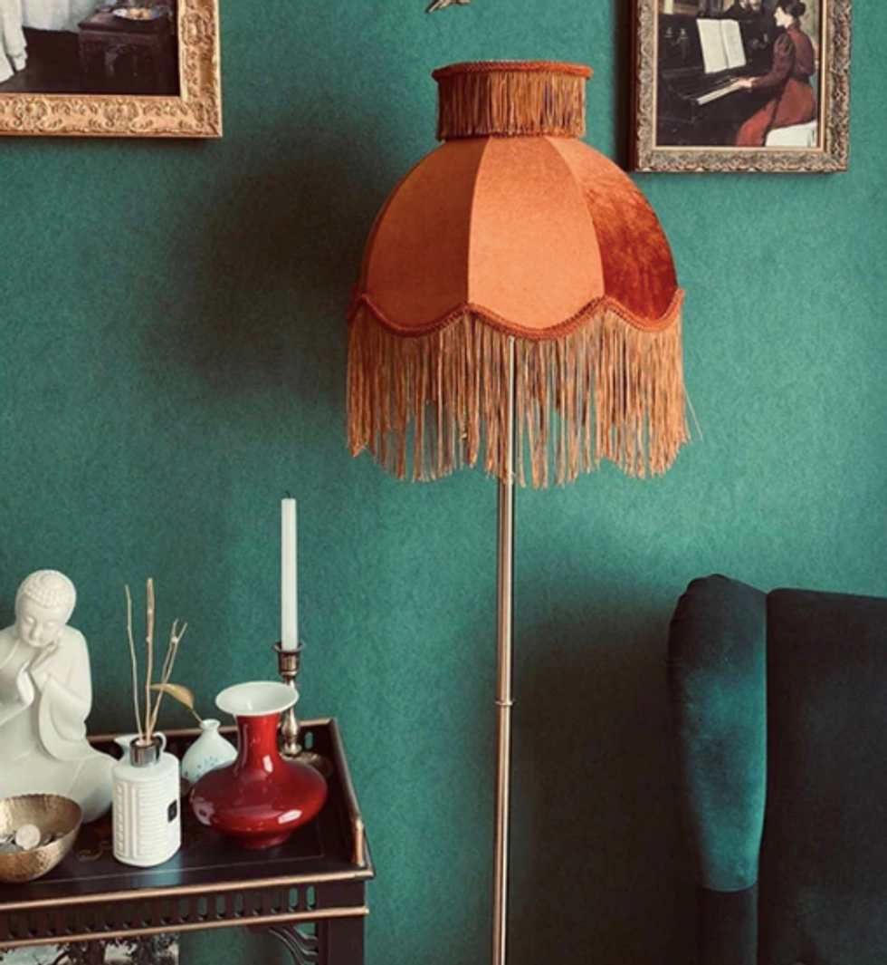 Tassels, velvet, and a rich peach shade make this the coziest lampshade money can buy. Add it to a room filled with warm, bright colors for a touch of old-world glamour.