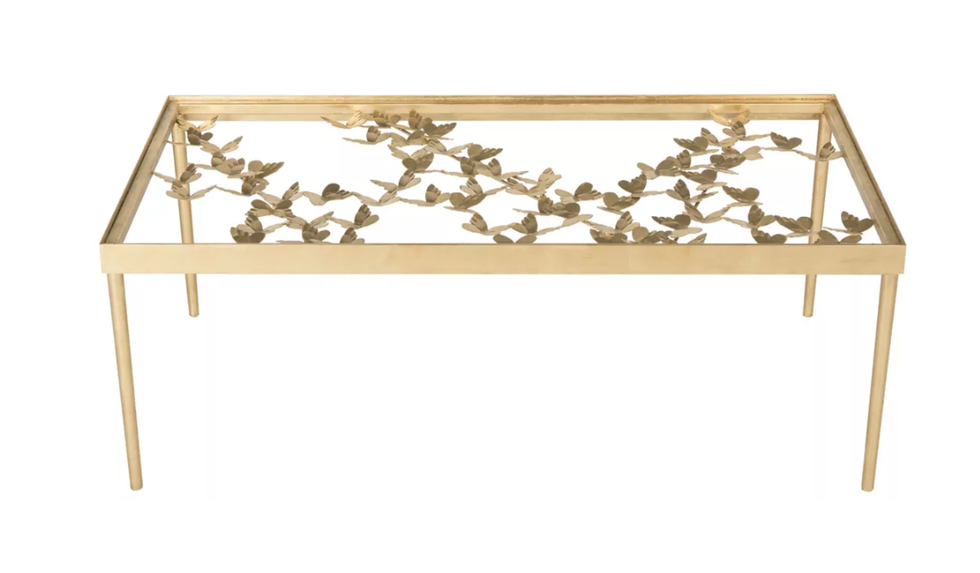 While we know it'll likely be covered with tchotchkes and colorful books, it does pay to add a spark in intrigue when you're investing in a coffee table. This one offers up a bit of springlike delight in the form of dancing, gilded butterflies inlaid throughout the glass top.