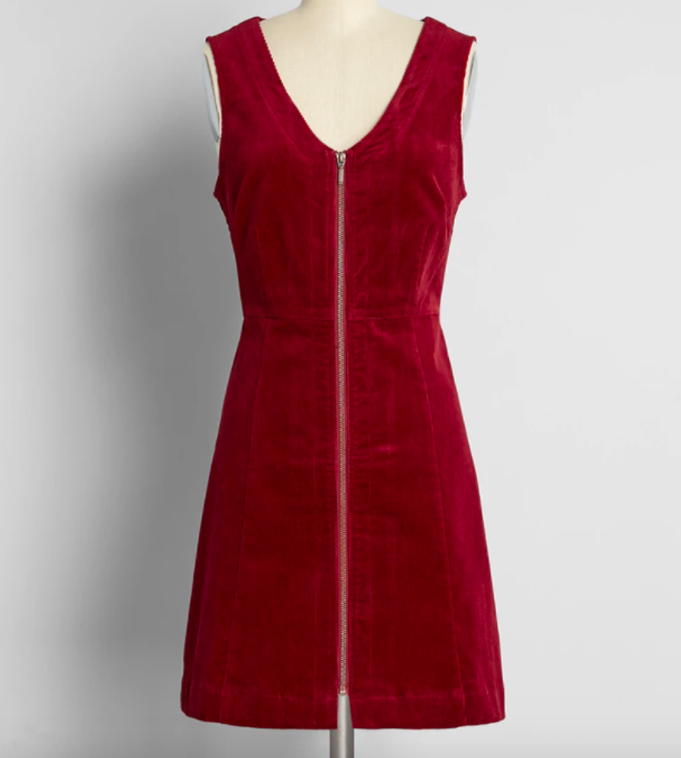 We can practically smell the chalkboard and pencil shavings with this incredible early fall dress. Indulge in lush corduroy in this delicious wine shade and get ready for dancing in September.