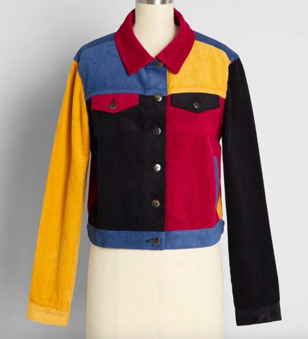 The 90s vibes are huuuge with this colorblocked stunner. We love the combination of primary colors blended with traditional denim, and there’s a matching skirt, too, in case you want a head to toe look!