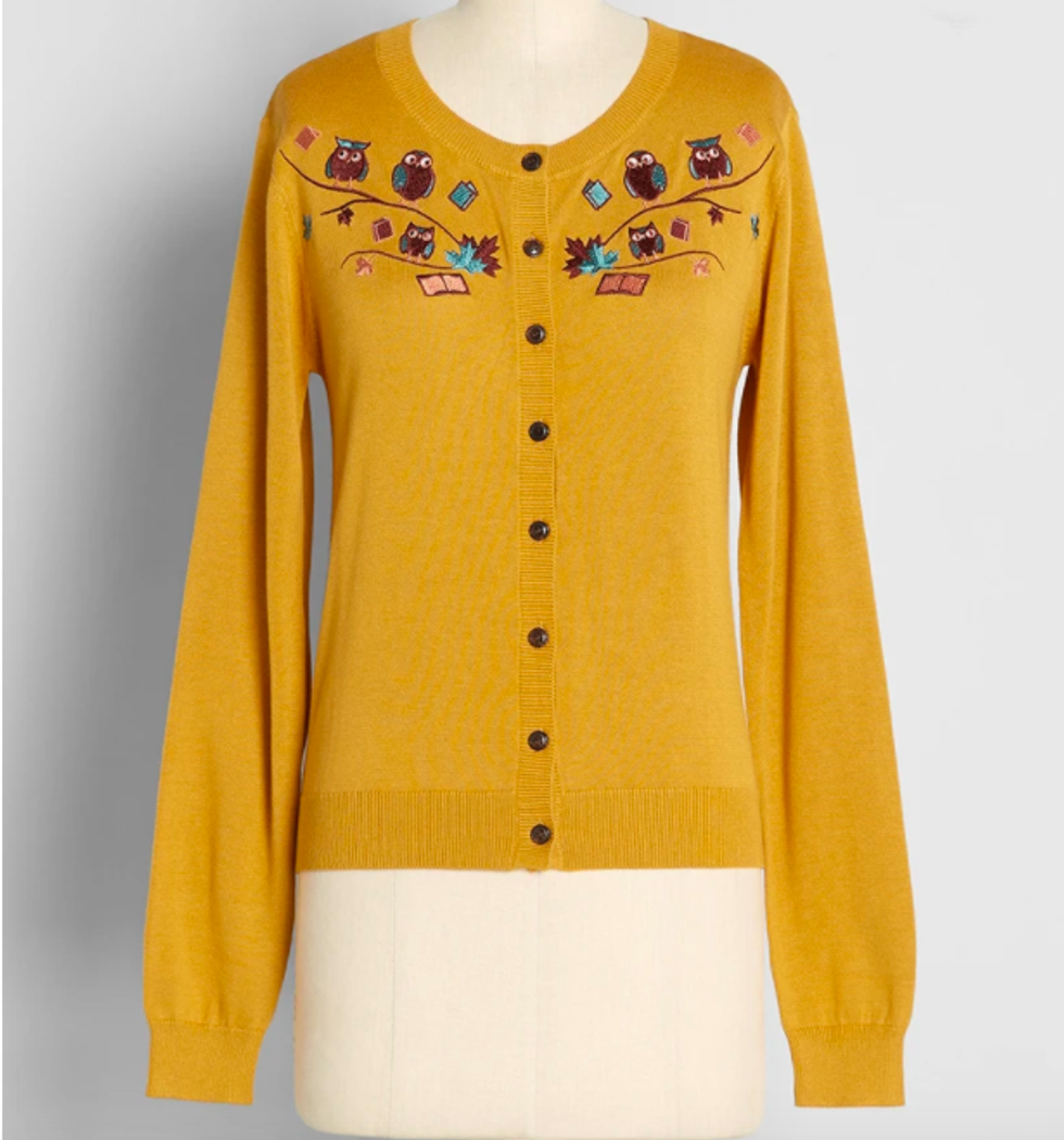 Mustard is one of the hottest colors for fall, so why not add a trend piece to your closet that also features studious-looking embroidered owls for an even cuter look?
