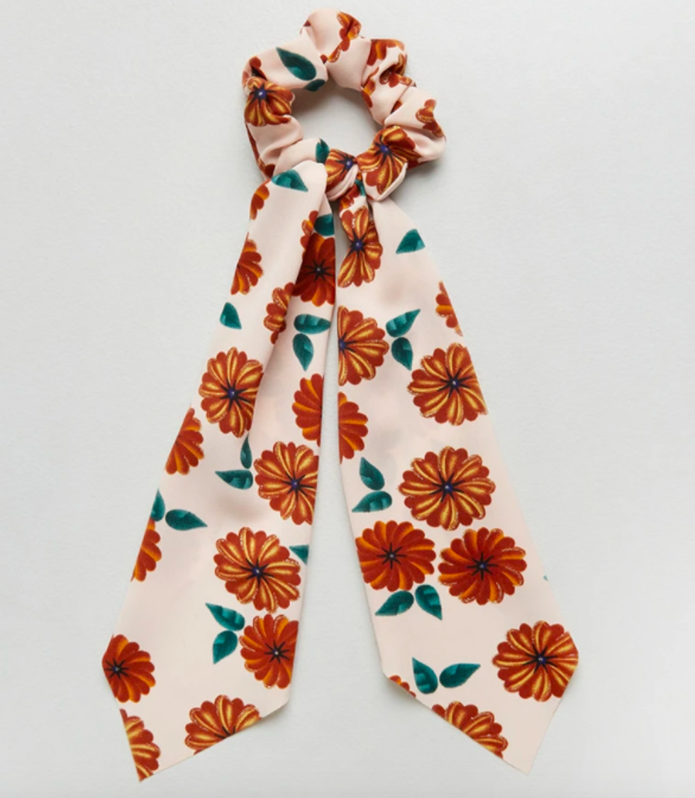 Like the colors of the changing leaves, you’ll feel the winds shifting right through your hair when you tie it back with this gorgeous scrunchie complete with flowing scarf detail.