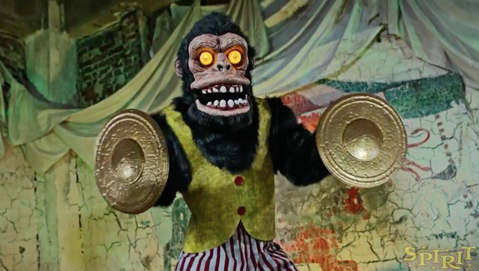 Circus freaks come one, come all! This spooky, towering primate is perched and ready to terrify with his straight-from-Hell eyes and foreboding cymbals that clang together with a startling crash. He whoops and grunts bystanders into a frenzy, warning all who dare come near to beware, lest he make you a permanent fixture of his eternal sideshow.