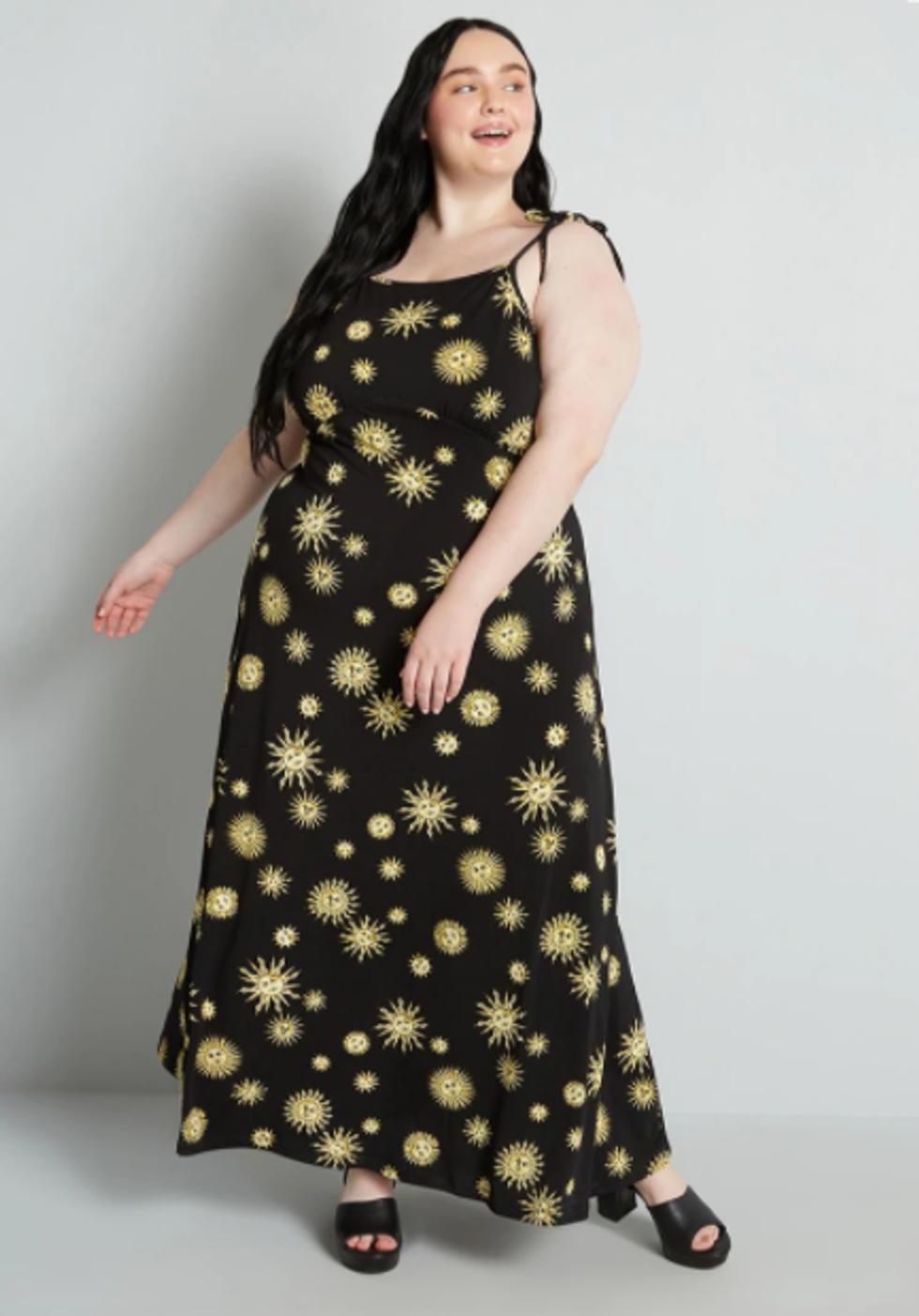 If you're not quite ready to leave dark colors behind but still want a pop of sunshine in your wardrobe, nab this celestial maxi for your springtime adventures. It's made from a lightweight rayon jersey knit, so it'll also come in handy as a quick beach cover-up for summer.