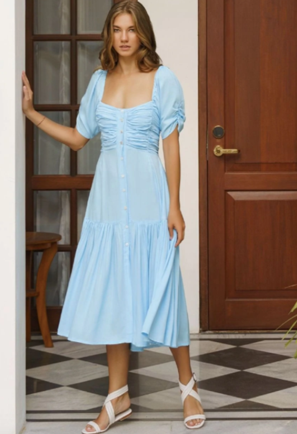 The milkmaid look is still trendy and flattering as ever. Try it for yourself with this fresh baby blue dress that lets you feel super feminine and put-together for your next sunny day picnic in the park.