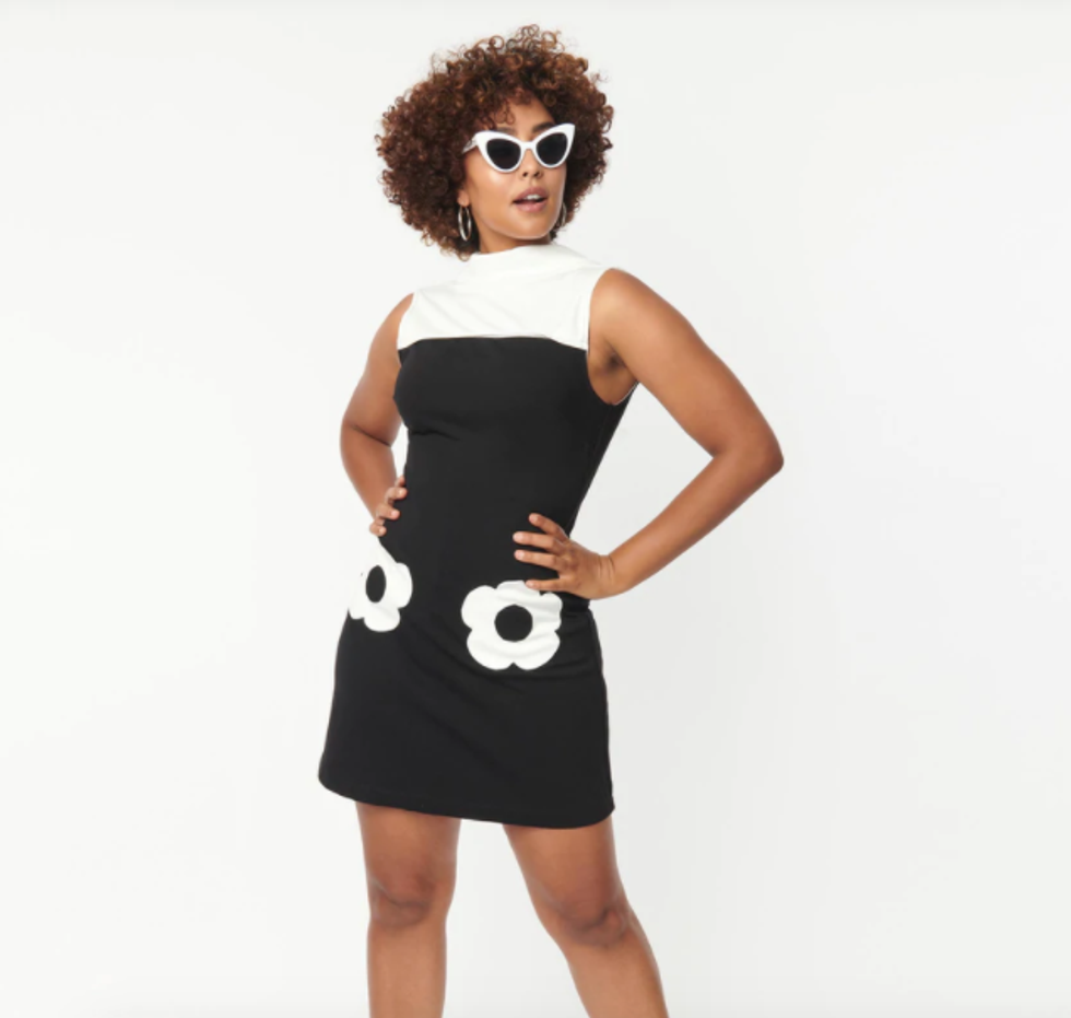 We're mad for mod with this short n' sassy shift dress that gives off major cool-girl energy with just a hint of spring with the graphic flowers at the hips. We love the dress styled here with white sunglasses and ankle boots (click through to see the head-to-toe look), but the basic shape and color scheme lend it a versatile edge.