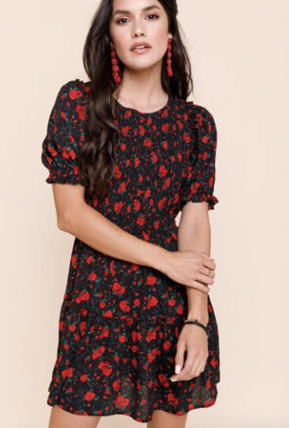 The red and black color combination is irresistible, and the higher neckline makes this easy to wear anywhere you might need to be a little more covered up. Wear it with a few pops of red (lipstick, earrings, etc.) to really set off the whole look.