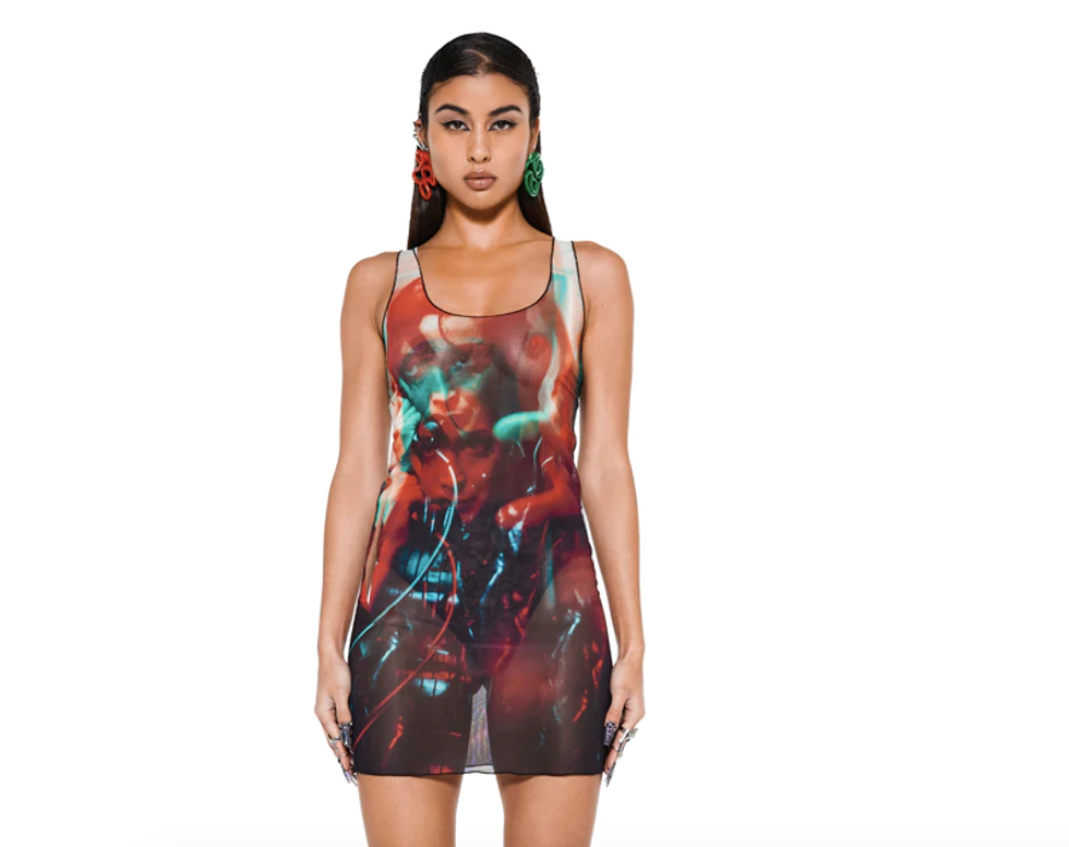 Calling all Matrix fans: This the the dress of the season! It features Trinity's stunning face alongside several futuristic graphics inspired by the famed film trilogy, and the mesh design is perfectly "in" with the current wave of throwback fashion. This will look perfect on the dance floor from now 'til next winter and beyond.