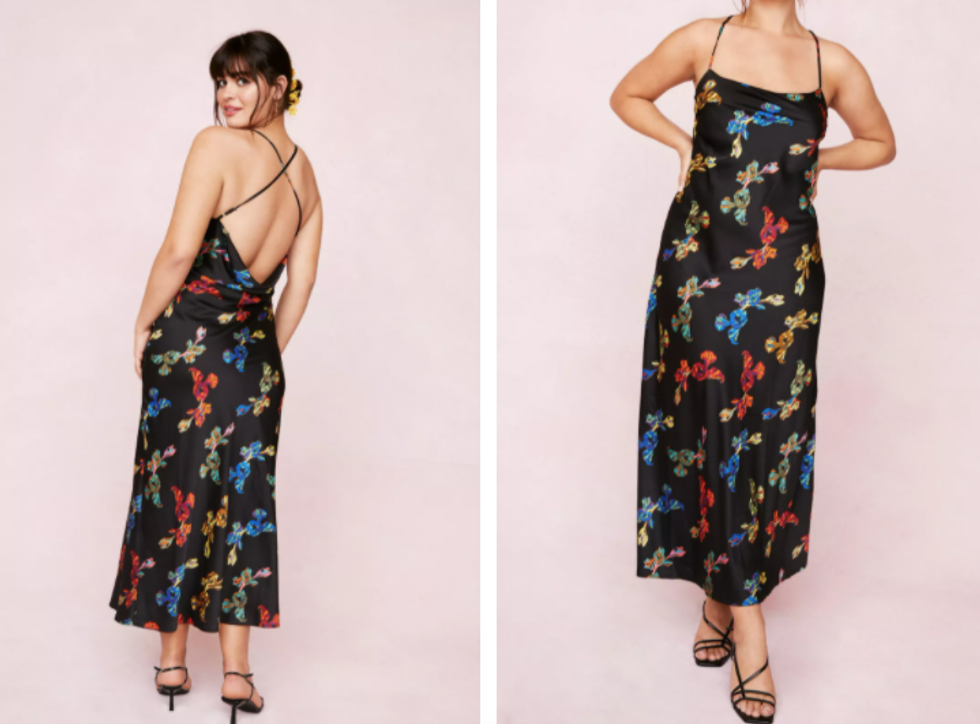 Satin is still a go-to fabric on the dress market right now, so enjoy the slippery, soft feel against your skin with this slinky print frock with a gorgeous dip and crossed straps in the back.