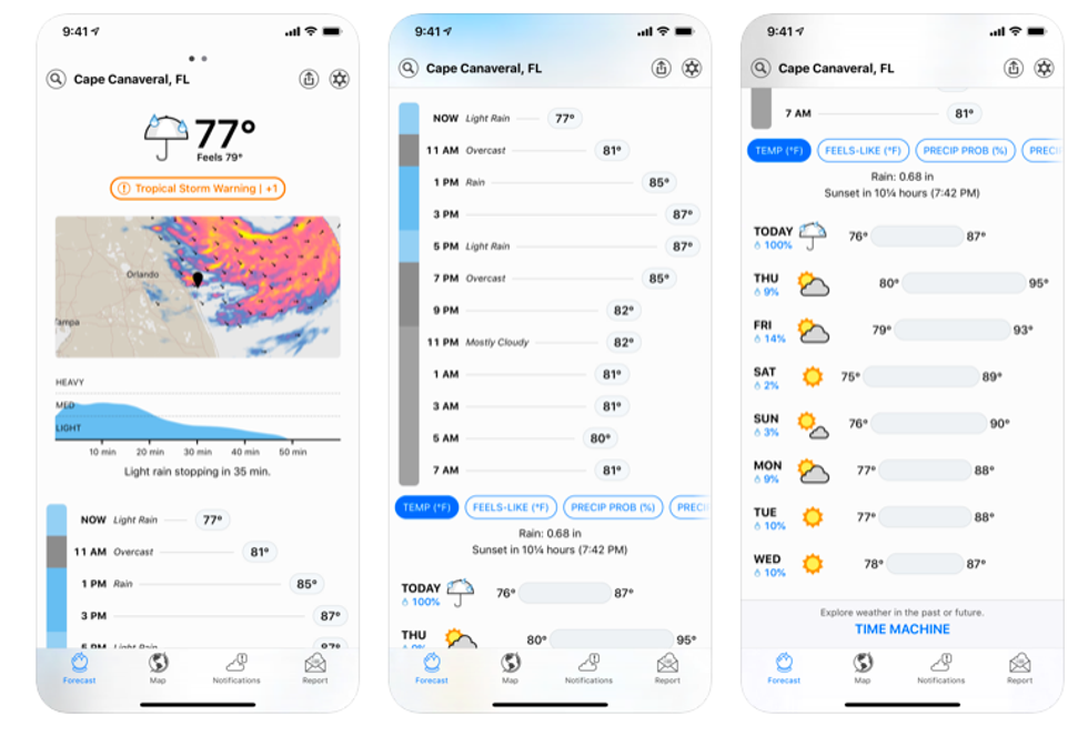 Dark Sky will predict up-to-the-minute forecasts using your precise location, and detailed maps show the exact movement of storms in your area so you’re not left trying to figure out whether that dark cloud across town will hit you or swerve just in time. The “Time Machine” feature is also a neat upside, as you can look to the past or future to see historical weather patterns and predictions made based on those and seasonal averages.