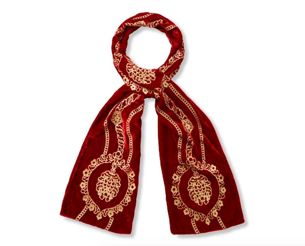 For a more high-end accessory, try this rich red velvet scarf from the Metropolitan Museum of Art’s store emblazoned with golden Tudor roses.