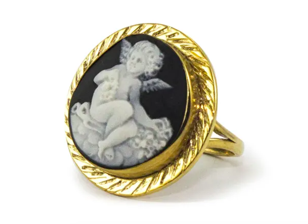 Cameos are an eternally stylish accessory for anyone who loves a bit of Victorian flair, and this one featuring a tiny cherub fits the Valentine’s Day theme to a tee.