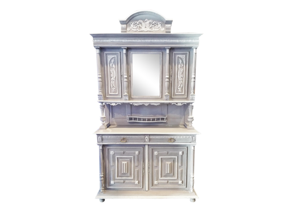 Newly painted and polished to perfection, this antique hutch has a whole new life ahead of it in your home and maybe someday your children's, too. It has five doors, three shelves, a beveled glass door, and locking top drawers for storing your most valuable silverware.