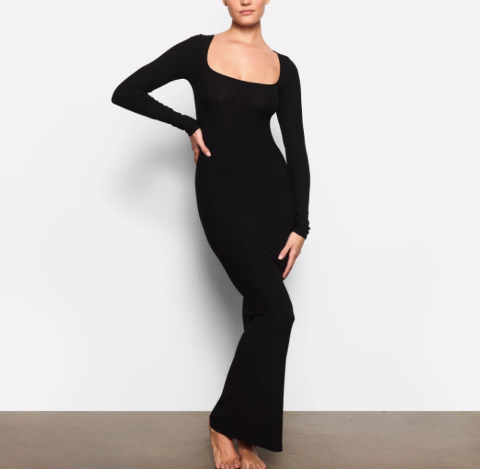 For another product that works at home and on the go, try the highly sought-after lounge dress from SKIMS. It drapes over curves beautifully with soft, stretchy modal material, and the neckline allows you to dress it up with the addition of a simple gold necklace for dinner out in the neighborhood.