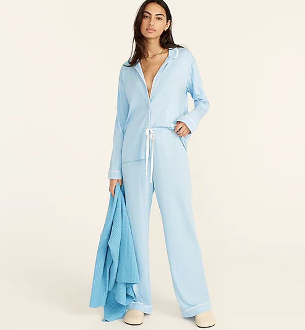 For a more traditional pajama look, try this timeless set from J. Crew in super-soft and drapey sustainable fabric. We love the baby blue and white piping combo but click through to see that spicy red option, too.